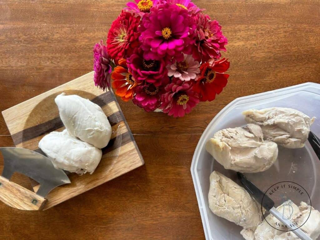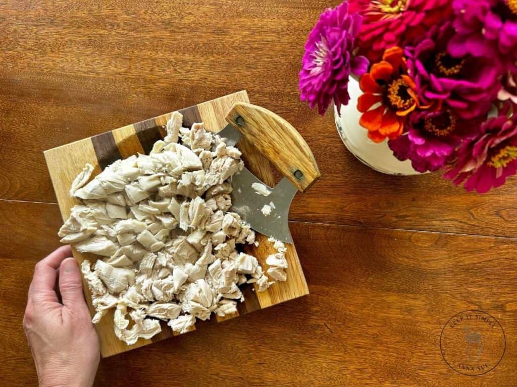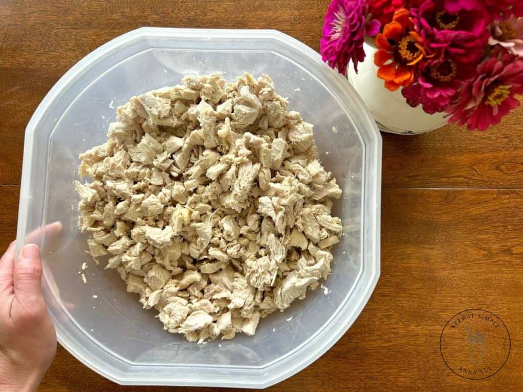 - 6 cups cooked chicken breast, shredded or cubed (about 2 ½–3 pounds, or 7–8 chicken breasts). I like to cut mine up and then pull it apart with my hands for a better texture. You can use leftover rotisserie chicken and leftover cooked chicken for a shortcut.
