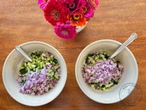 - Stir in the diced cucumber, diced red onion, and diced red pepper.