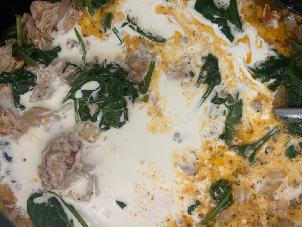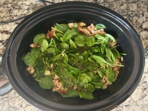 Add everything but the spinach and heavy cream, cook on low for 3 hours, shred the chicken, add in the spinach and heavy cream and you are done!