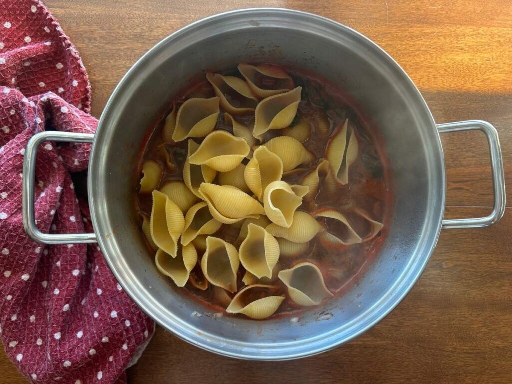 Add the broken lasagna noodles or the jumbo shells. Both work great. Any pasta works, honestly. Drop the heat to low but keep a gentle boil. Cook the pasta for about 12 minutes. The jumbo shells usually need the full time.
