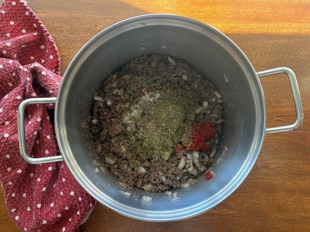 Grab a large pot. Set it over medium-high heat. Add the olive oil. Add the ground venison, the onion, and the garlic. Brown everything until the meat cooks through and gets some color.