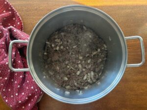 - In a large soup pan with 2 tbsp. olive oil, brown the ground venison, garlic and diced onion over medium-high heat.