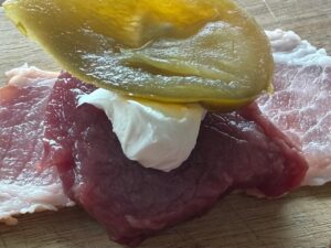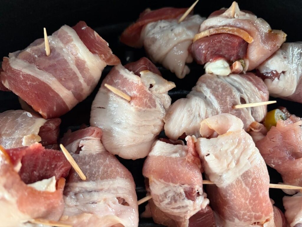 Then wrap the bacon around everything and secure it with a toothpick.