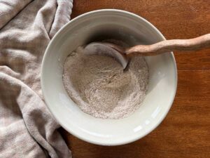- In a large bowl, combine the fresh milled flour, cornstarch, salt, baking powder, cinnamon and nutmeg.