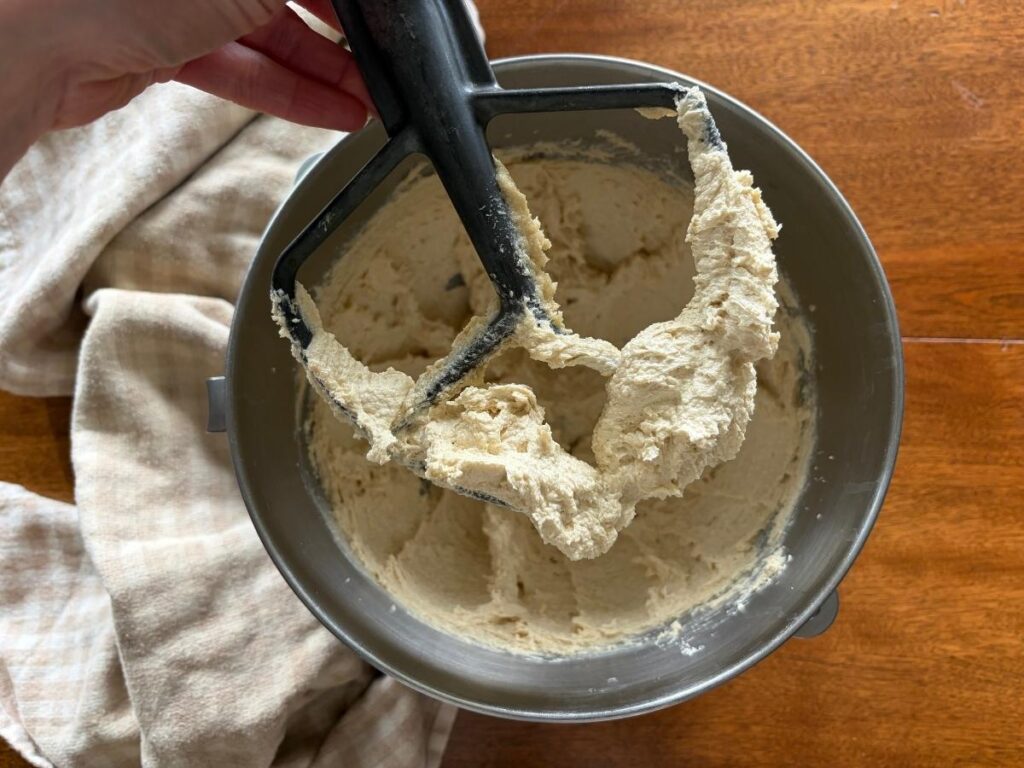 Cream the mixture for about 4 minutes until it becomes light and fluffy.