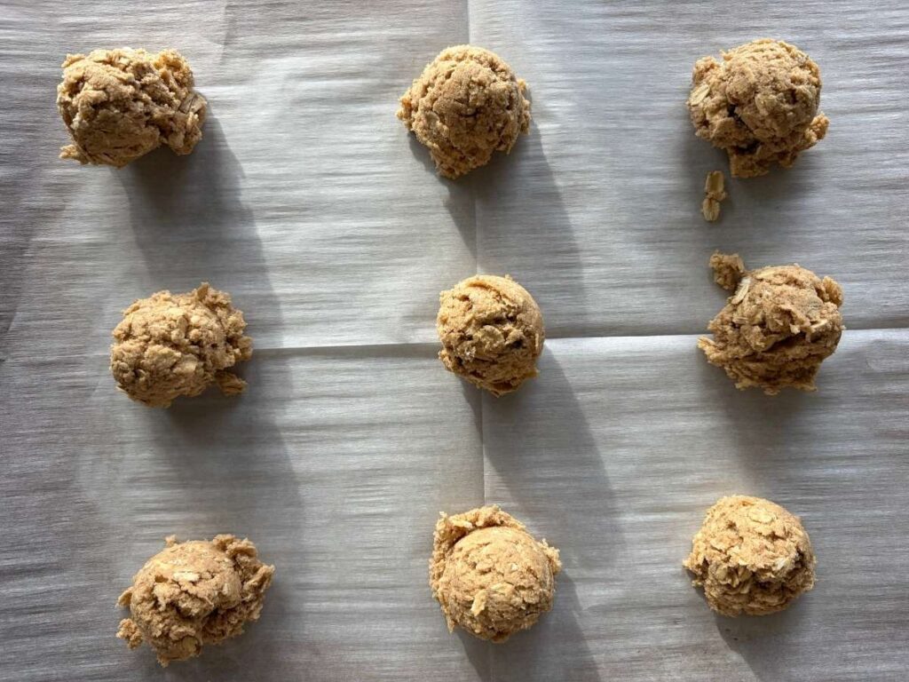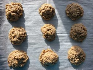 Scoop the cookie dough in random spoonfuls onto your prepared baking sheet.
