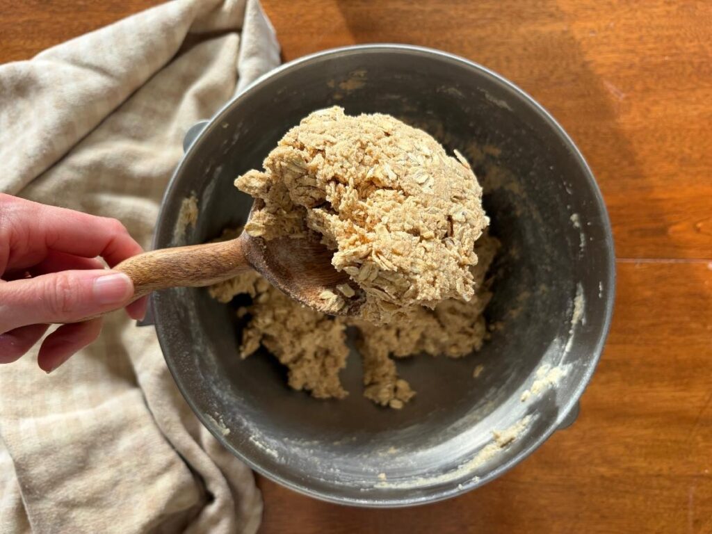 At this point, the dough for these Crumbl copycat oatmeal cookies with fresh milled flour should look thick, soft, and full of oats.