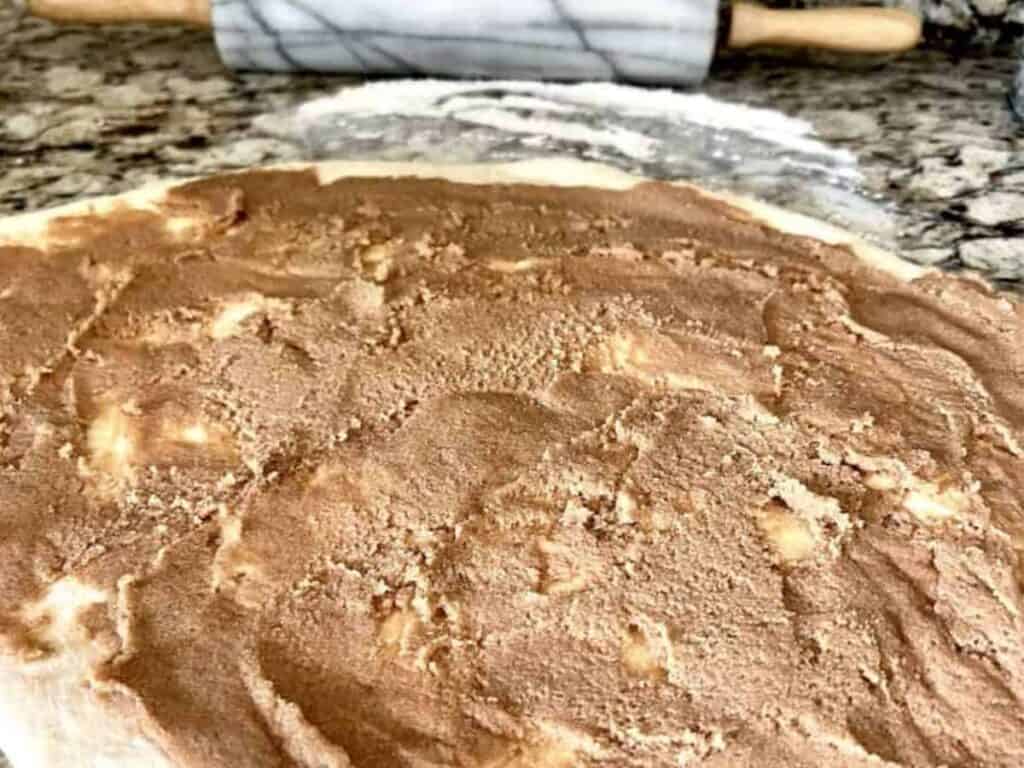 Sprinkle plenty of flour on the counter, and roll out dough into a large rectangular shape. Mix together the brown sugar, softened butter, and cinnamon.