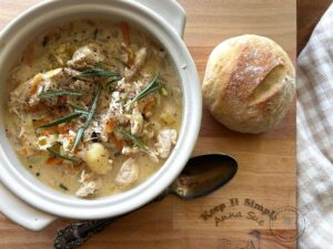 This creamy soup is perfect for leftover turkey or even your wild turkey breast. You can also use chicken from the grocery store, or swap in rotisserie chicken. If you go that route, you’ll only need about 10 minutes to heat it through.