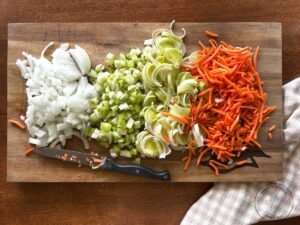 Lower the heat slightly and add the butter. Once melted, add the onion. Cook for 4 minutes. Add the leek with ¼ teaspoon salt. Cook another 4 minutes. Stir in garlic, celery, carrots, the rest of the rosemary, salt, and pepper. Add the chicken stock.