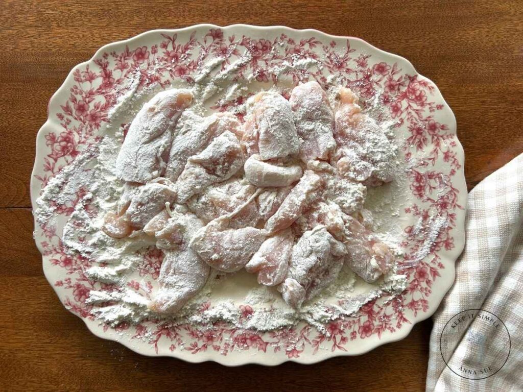 First, slice your turkey into strips. Season it with salt, pepper, and a little rosemary. Save some rosemary for later. Pour the flour onto a large plate. Coat each piece of turkey lightly in flour. Shake off the excess.