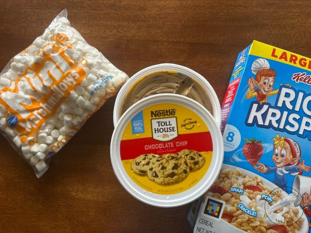 - Half batch: ½ tub cookie dough, 1 cup rice krispies, ½ cup mini marshmallows.
