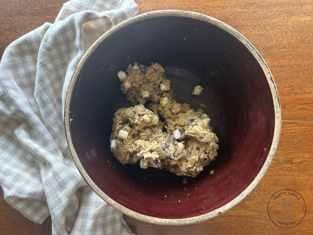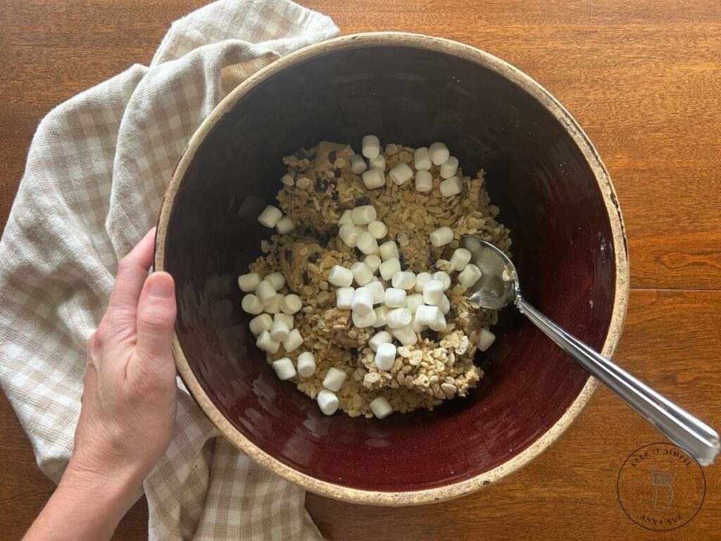 In a large mixing bowl, combine your room temperature cookie dough, rice krispies, and mini marshmallows. Start with a spoon, but then go ahead and use your hands—clean hands, of course! It mixes so much easier that way. Don’t overmix. Just get everything combined.